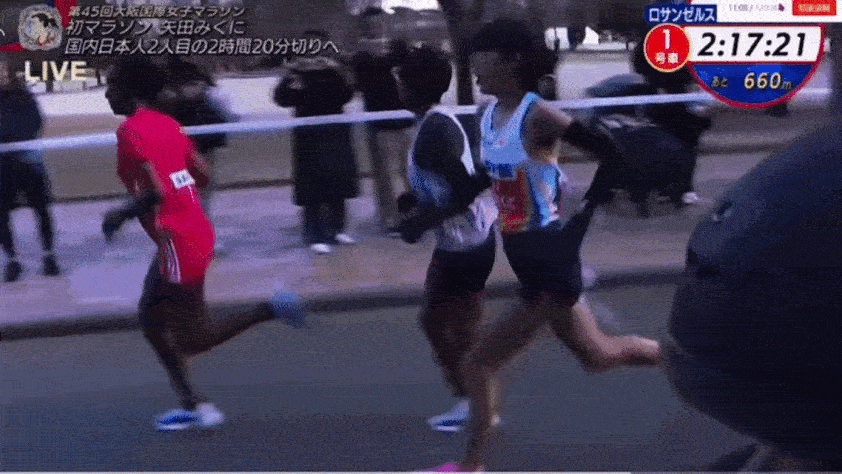 40.5公里,矢田美久追赶上了沃克奈什·埃德萨和贝达图·希尔帕,并在40.7公里时超过了俩人,处在第二位。这段极限拉扯让马拉松比赛的最后时刻,再次演变成加速跑。