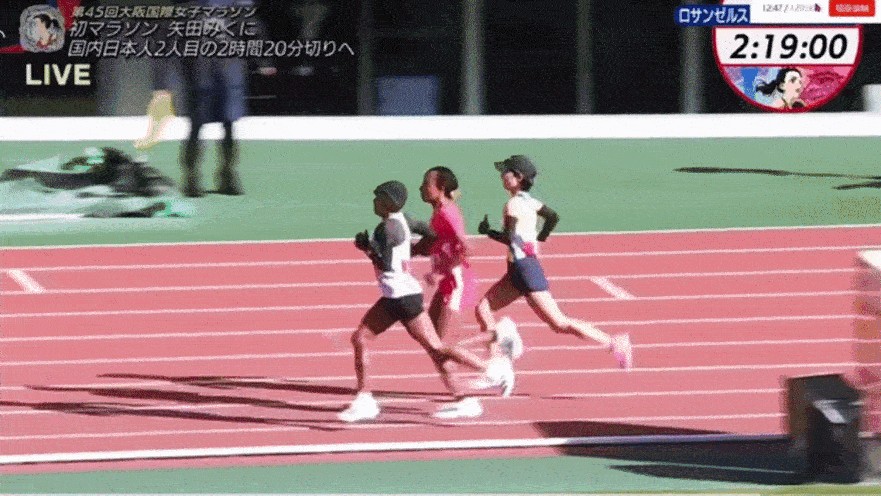 进入体育场,比赛来到最后200米,矢田美久还在试图加速,看能否有一线希望反超对手,只是沃克奈什·埃德萨和贝达图·希尔帕没给她这样的机会,提速甩开矢田。从弯道进入直道,比赛时间已过去2:19:48,沃克奈什·埃德萨还警觉着回头,生怕矢田美久再次反超。