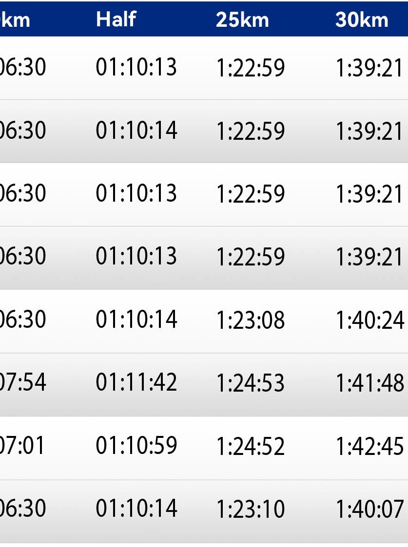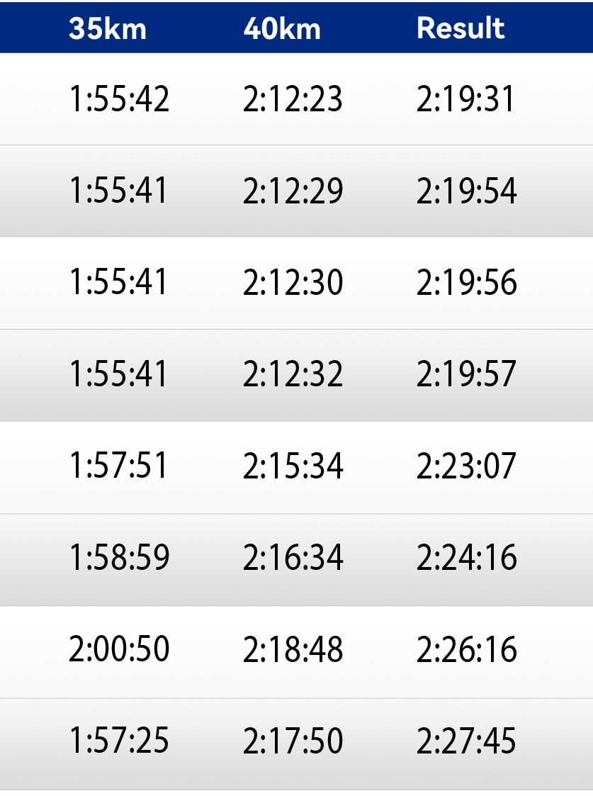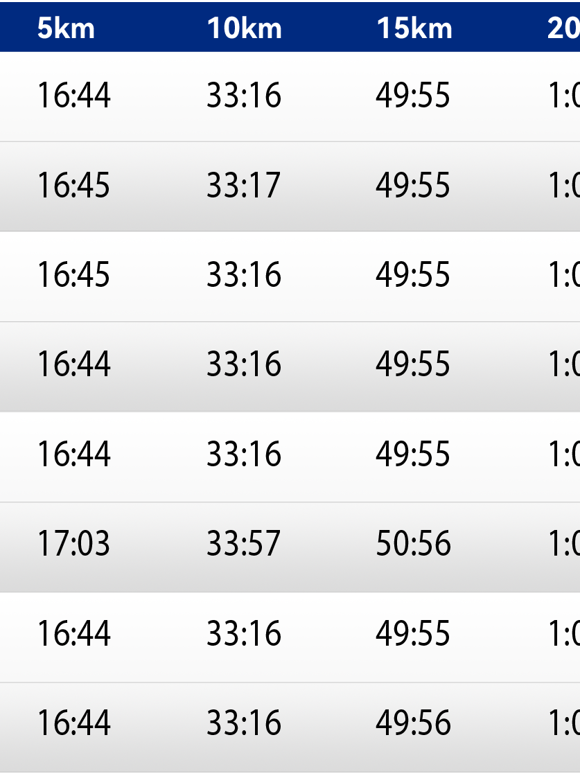 大阪国际女子马拉松的第一集团配速员的配速是每5公里16分35秒(2:19:56完赛),第二集团的配速员配速是每5公里16分55秒(2:22:45完赛)。